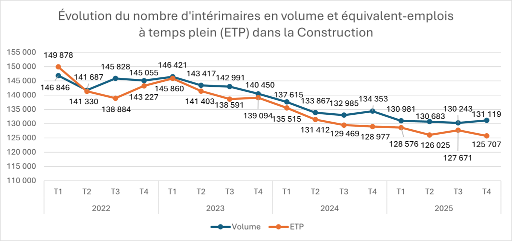 Pour l’année 2025, la baisse de l’emploi intérimaire a été de 2,4 % (soit -3 300 intérimaires) dans le BTP à l’instar de tous les secteurs confondus dont la diminution s’élève à 4,6%. Il s’agit donc d’une année de stabilisation par rapport à la tendance à moyen terme.