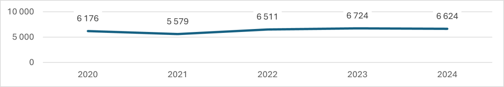 Entre 2020 et 2024, le nombre total de diplômés d’un BTS relevant des spécialités pouvant mener aux métiers du BTP passe de 6 176 à 6 624, soit une progression de +7 %.