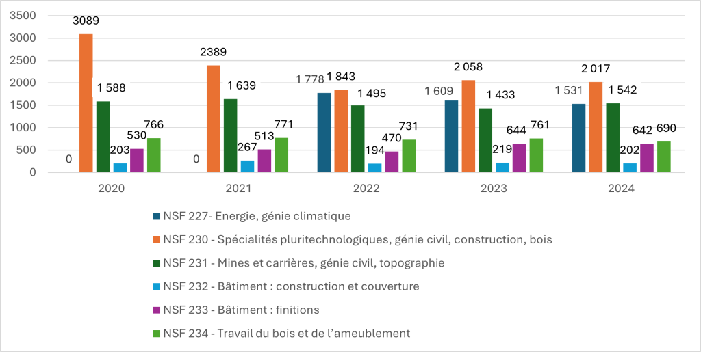 Sous cette réserve, certaines évolutions peuvent être mentionnées à titre indicatif. Les spécialités « pluri- technologiques, génie civil, construction et bois » diminuent fortement sur la période (-35 % entre 2020 et 2024), tout en restant le groupe le plus important en effectifs. Les spécialités « Bâtiment : finitions » progressent de +21 %. Les formations relevant de l’énergie et du génie climatique reculent de -14 % entre 2022 et 2024.