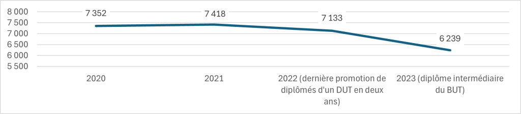 Entre 2020 et 2022, dernière promotion de diplômés de DUT en deux ans, le nombre de diplômés passe de 7 352 à 7 133, soir une baisse de –3 %. Après un pic observé en 2021 (7 418 diplômés), les effectifs reculent progressivement. L’année 2023 est particulière : cette année-là, le DUT est devenu un diplôme intermédiaire du diplôme intermédiaire de la Licence professionnelle « Bachelor universitaire de technologie » (BUT).