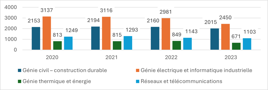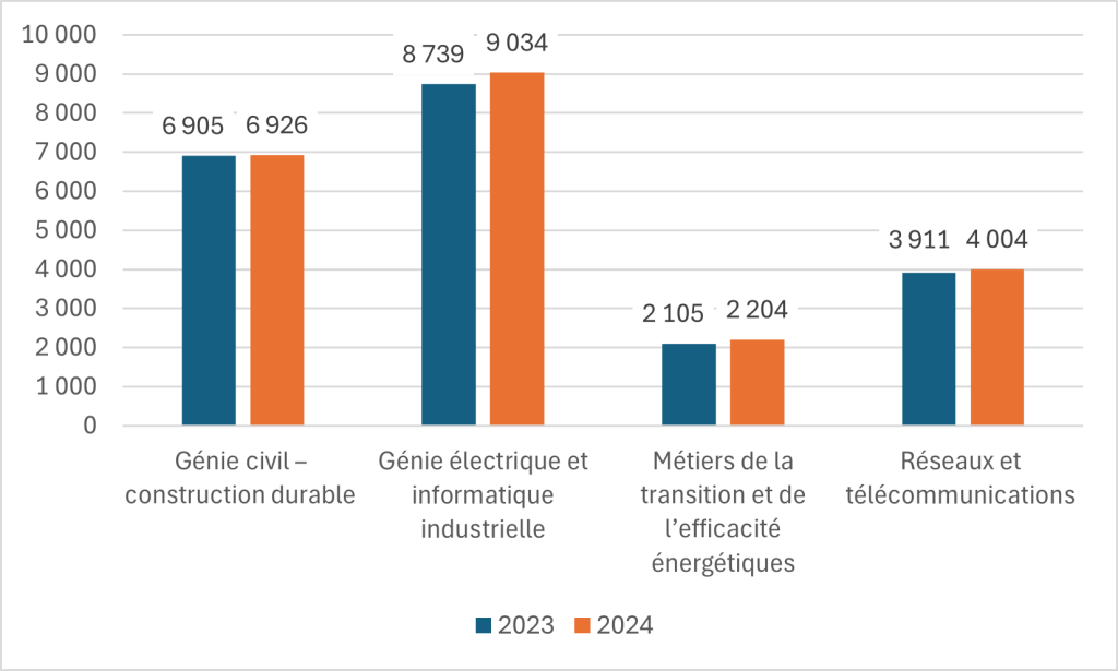 Le « génie électrique et informatique industrielle » reste la première spécialité et progresse de 8 739 à 9 034 inscrits (+3 %) (graphique n°3). Le « génie civil – construction durable » demeure stable (6 905 à 6 926 inscrits, +0,3 %). Les réseaux et télécommunications passent de 3 911 à 4 004 étudiants (+2 %). La spécialité « Métiers de la transition et de l’efficacité énergétiques » enregistre la hausse la plus dynamique, passant de 2 105 à 2 204 inscrits (+5 %), malgré des volumes plus réduits.